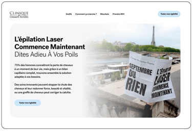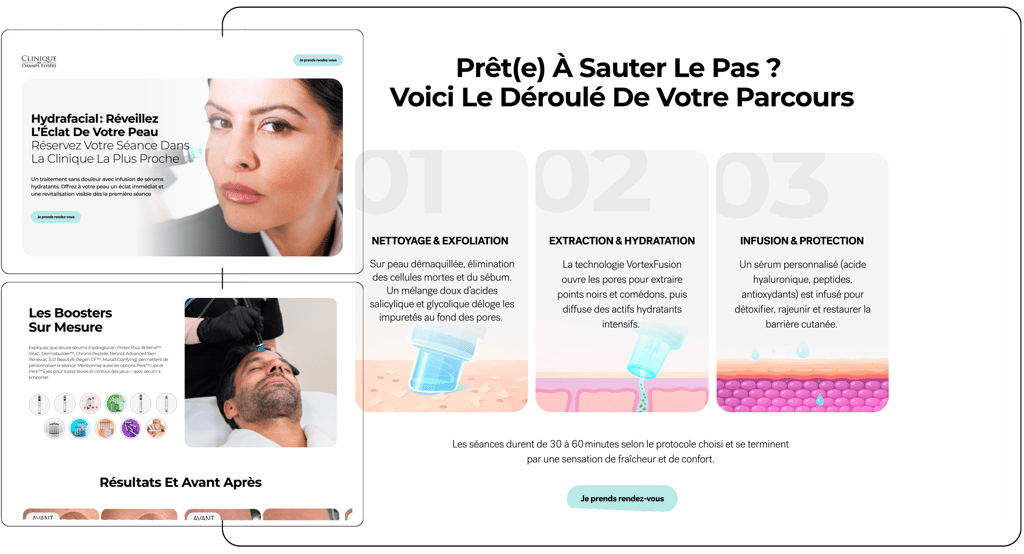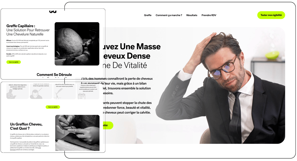 L’expérience est pensée pour convertir : parcours simplifié, CTA visibles, argumentaires clairs et rassurants. Chaque élément, du design au wording, renforce la crédibilité et l’expertise médicale tout en offrant une expérience haut de gamme et accessible.
