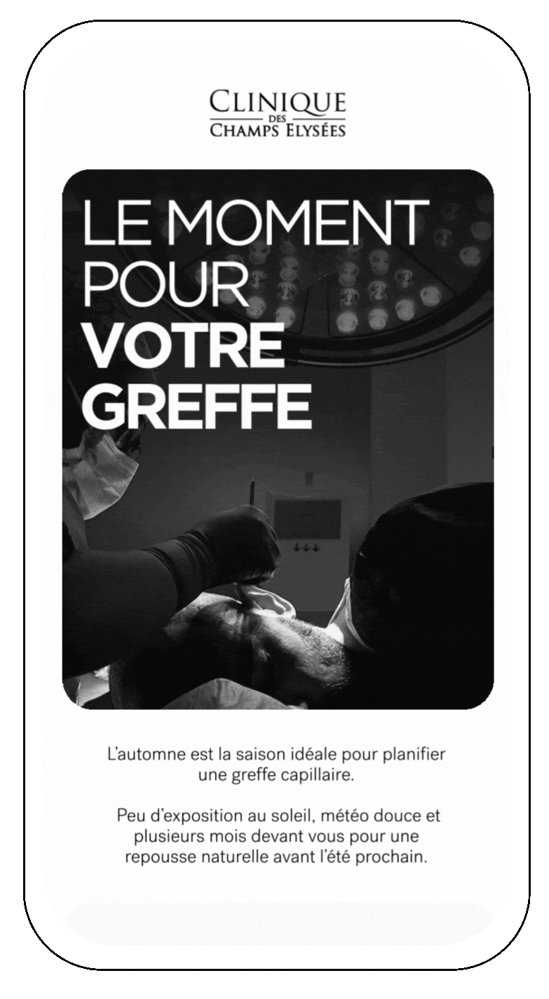 La direction artistique transpose l’univers premium de la Clinique dans le digital : mise en page minimaliste, typographie structurée et visuels affirmés pour se démarquer des codes médicaux classiques.