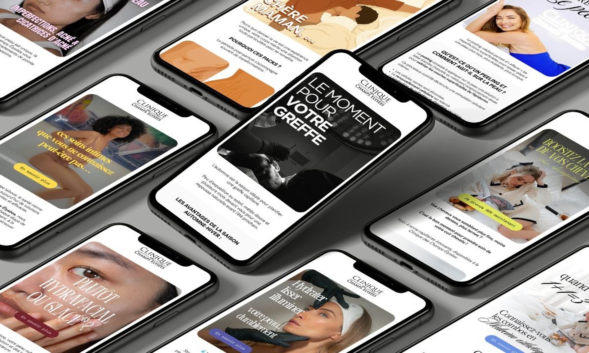 Création des supports digitaux de la Clinique des Champs-Élysées : landing pages (Unbounce) et campagnes email (Klaviyo).