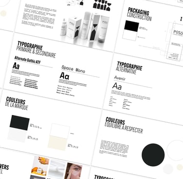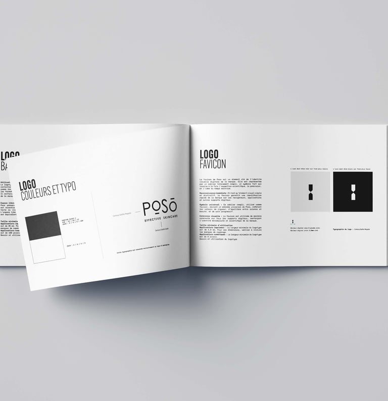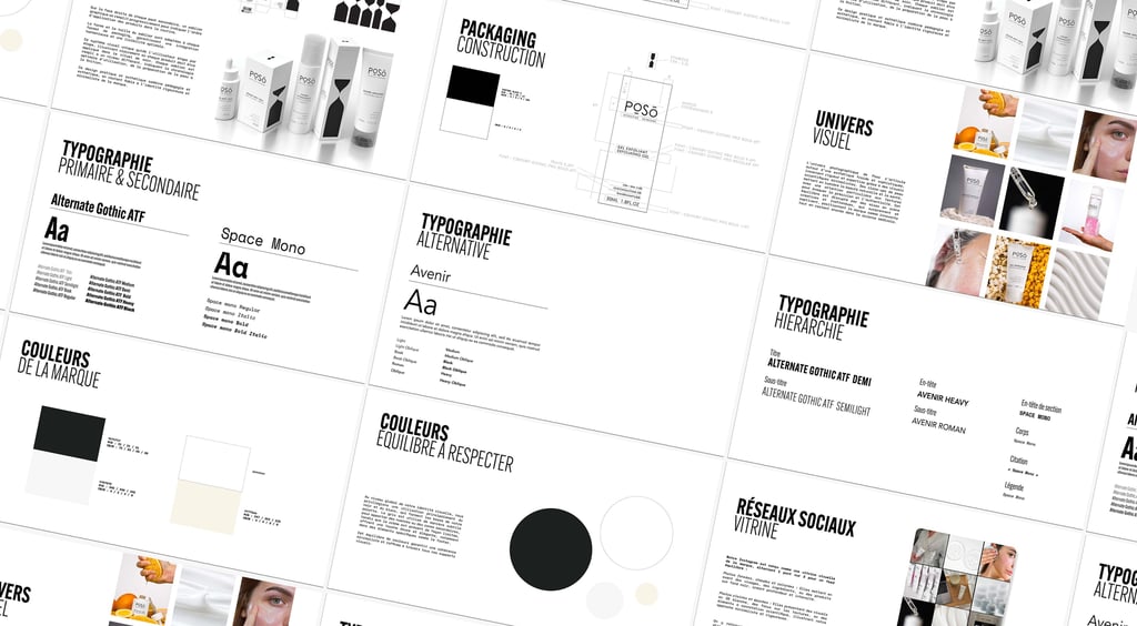 L’identité visuelle est construite de façon claire et structurée : palette neutre, typographie sans-sérif à chasse fixe, mise en page grid-system pour structurer l’information et créer du rythme visuel. Le sablier est la signature de la marque. Présent sur les packagings secondaires, son niveau de remplissage varie selon l’étape du produit dans la routine, un repère visuel simple et systémique.