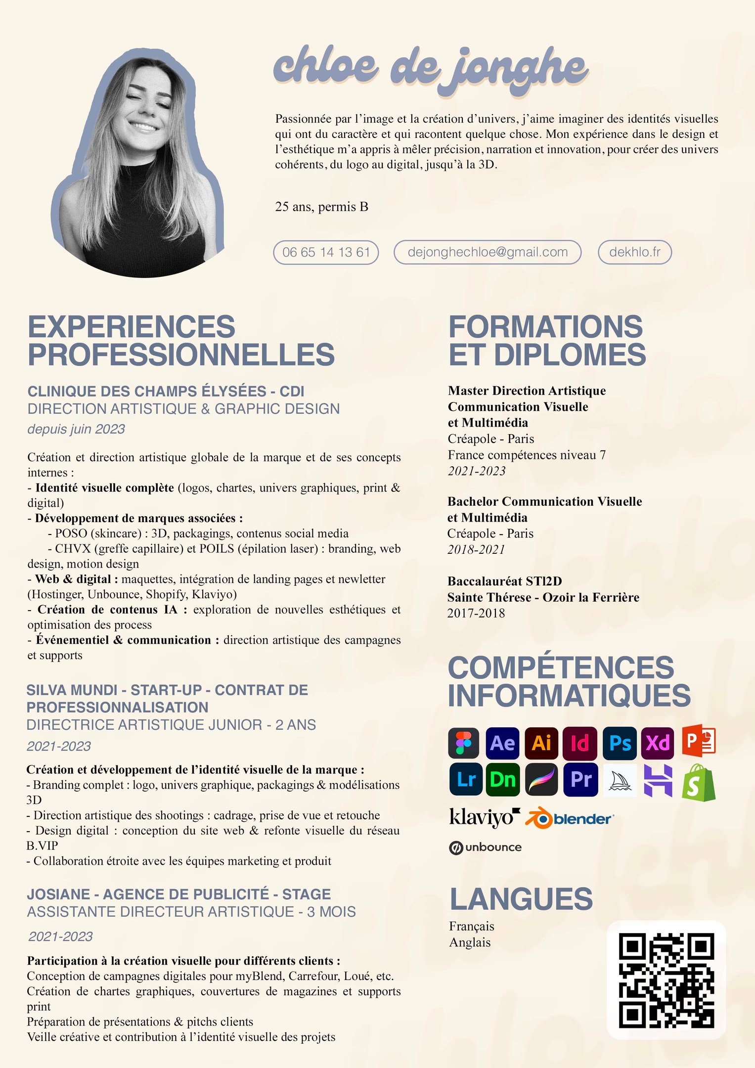 J’ai obtenu un Master en Direction Artistique, Communication Visuelle et Multimédia à CREAPOLE Paris, diplôme reconnu niveau 7 par France Compétences, avec les félicitations du jury. Avant cela, j’ai validé un Bachelor en Communication Visuelle et Multimédia au sein du même établissement. Mon parcours académique a débuté avec un Baccalauréat STI2D obtenu à Sainte Thérèse à Ozoir-la-Ferrière.